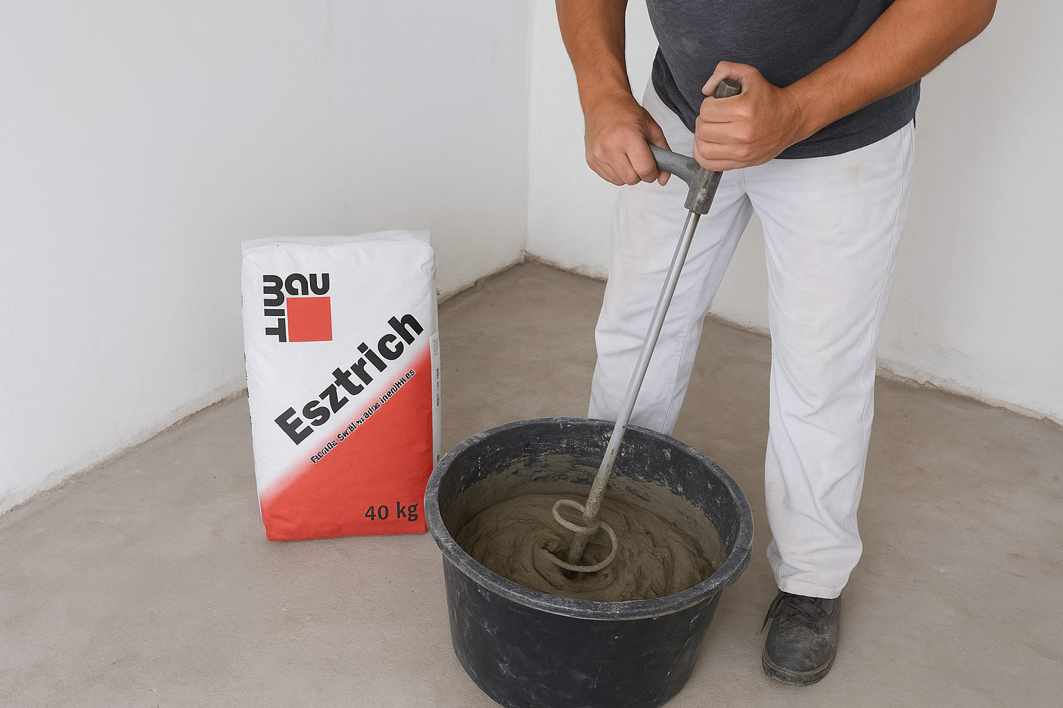 - A keverés pofonegyszerű: egy zsákhoz kb. 4–5 liter víz kell, majd keverd csomómentesre. Használj keverőszárat vagy gépet. A friss keveréket az előre kijelölt rétegvastagságba simítsd, lehetőség szerint esztrichprofilokkal (vezetősínekkel), hogy egyenletes réteget kapj. A vastagság általában 35 mm körül ideális, padlófűtés esetén ennél kicsit vastagabb réteg is lehet.